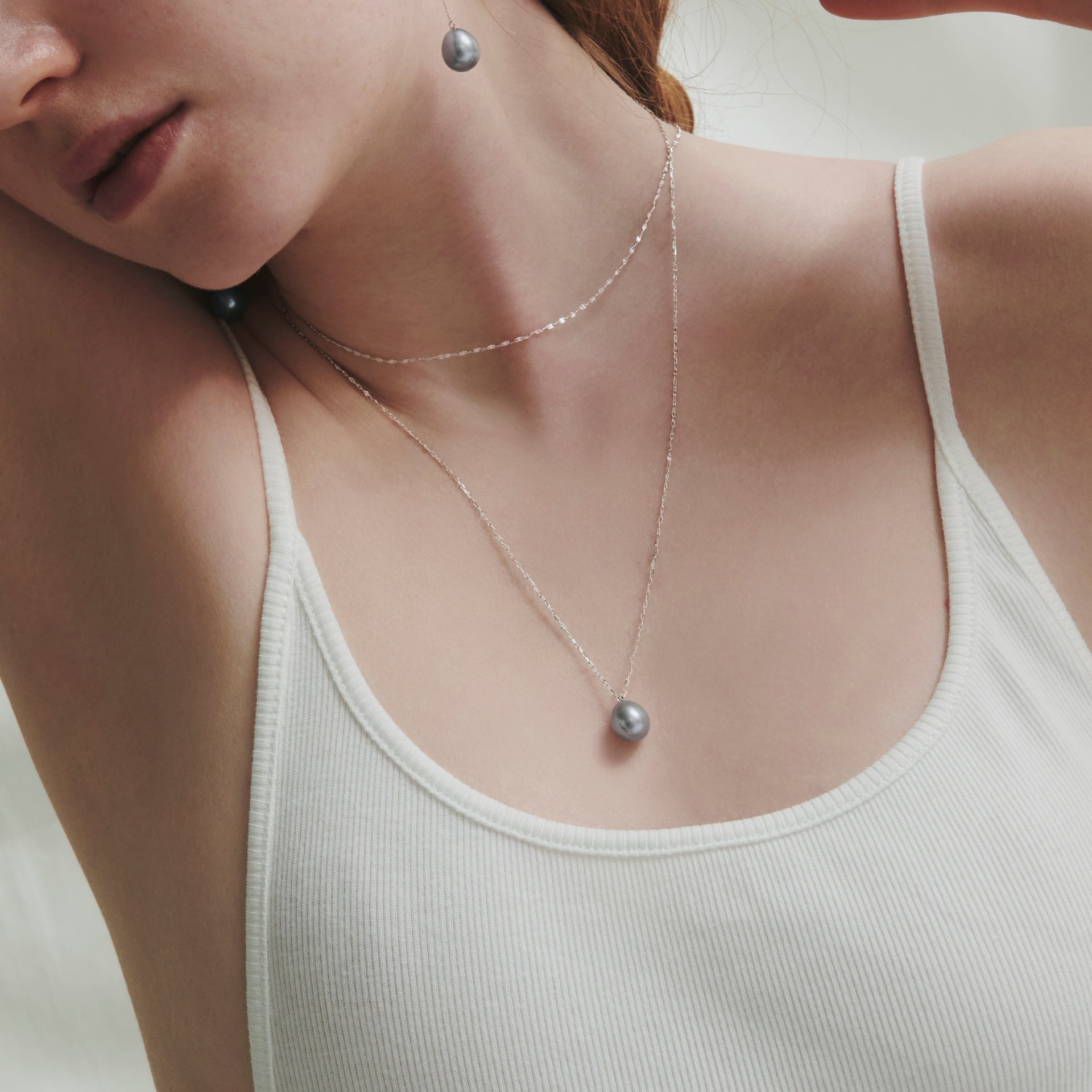 淡いグレーのヴェールを纏ったパールは成熟の美をたたえ、肌に寄り添うシルエットとともに上品な洗練を引き寄せます。