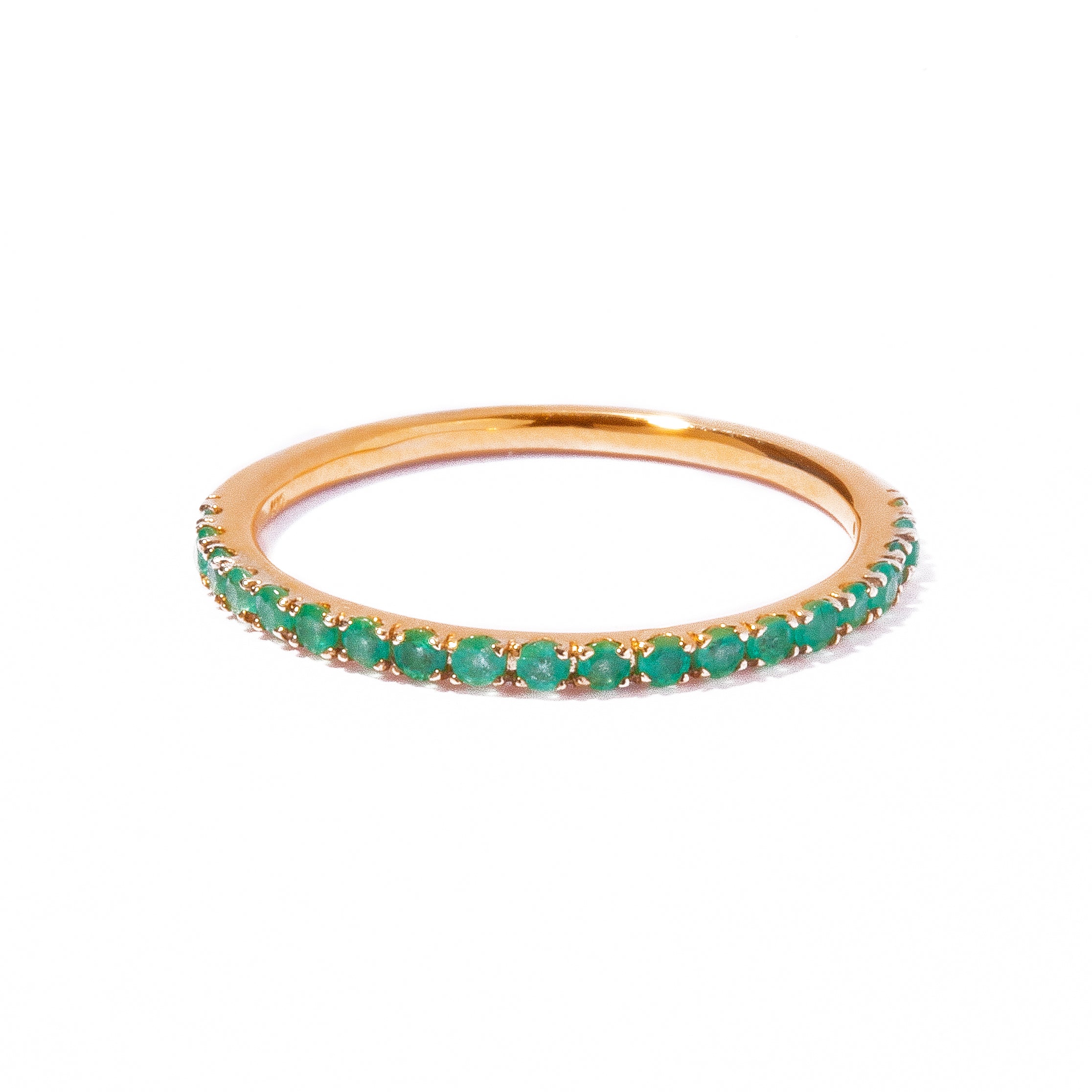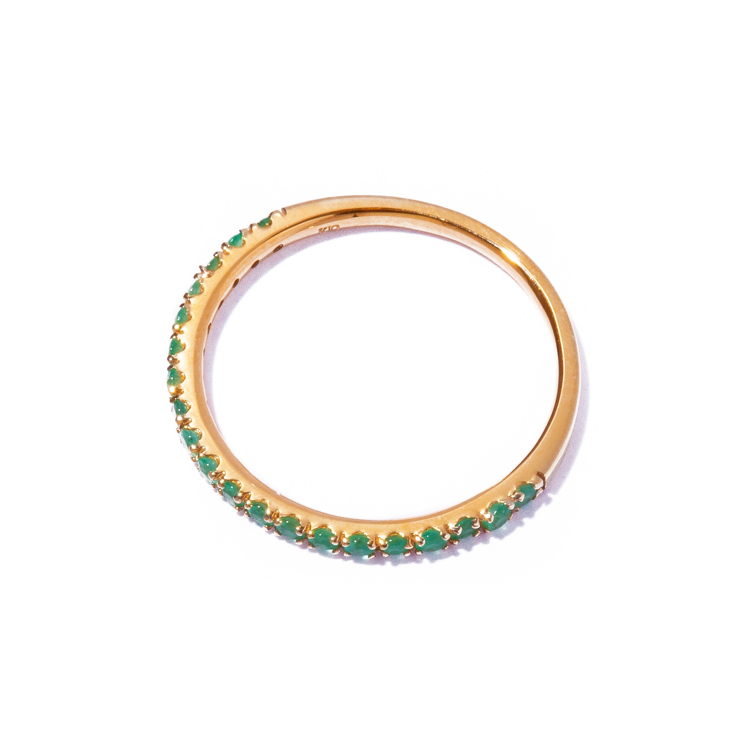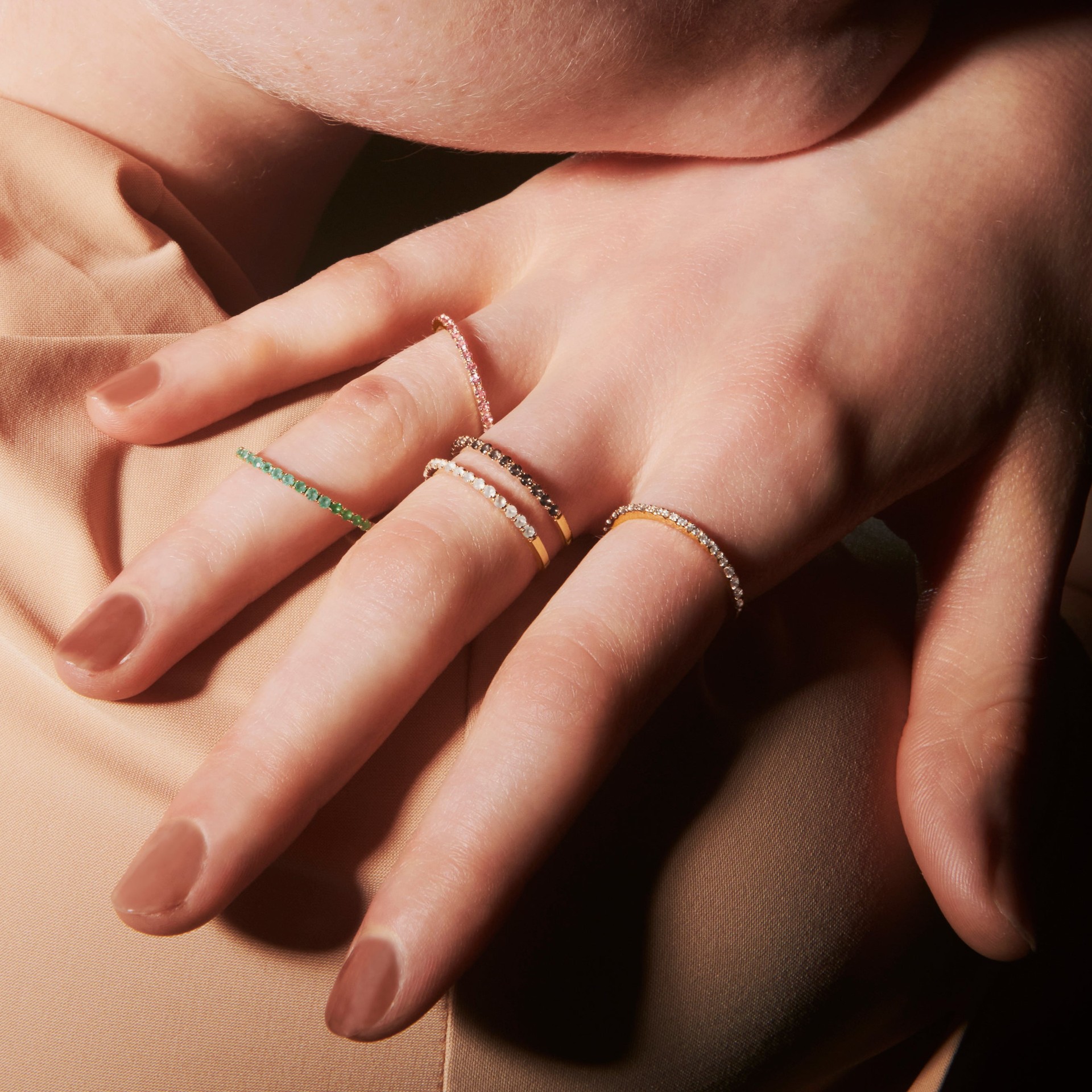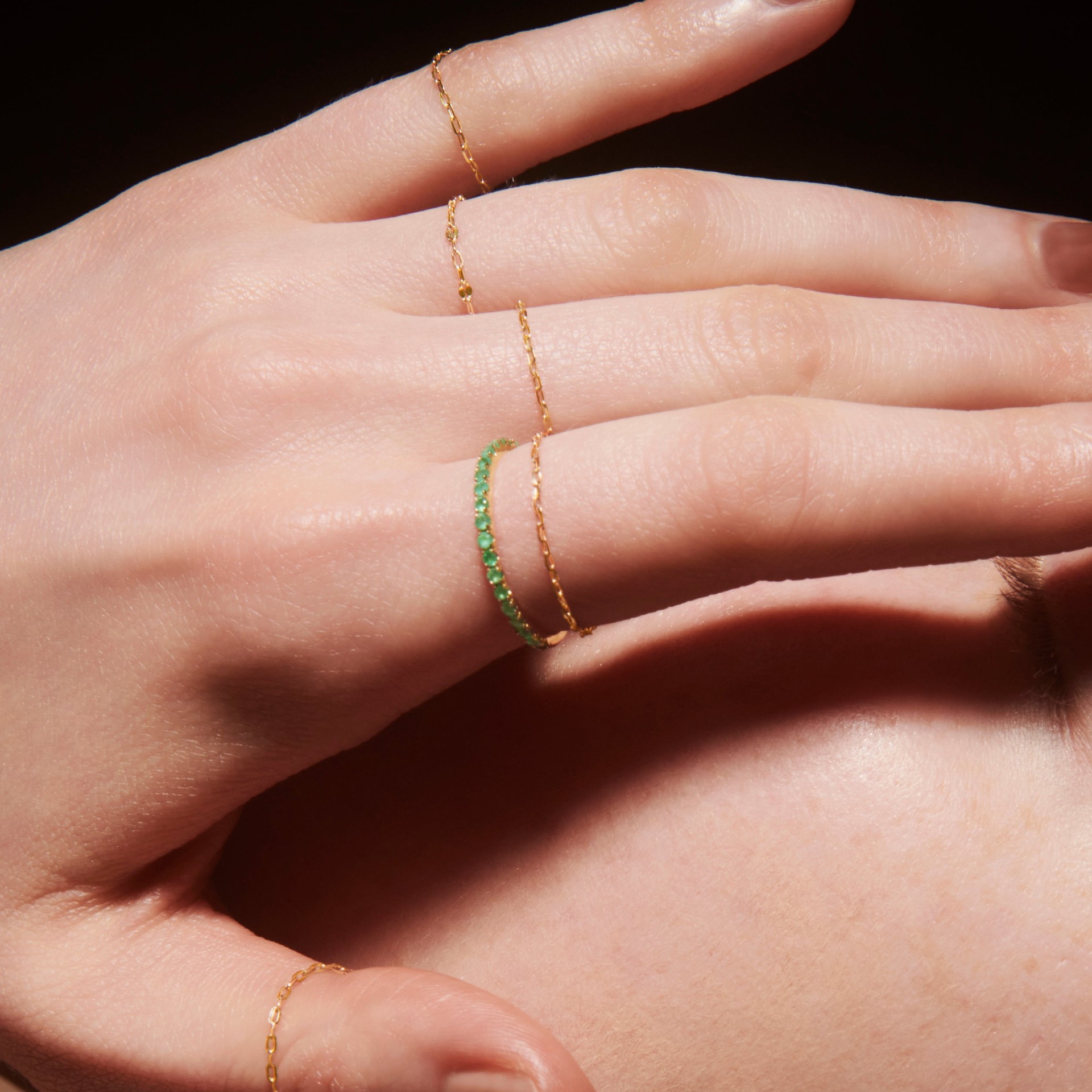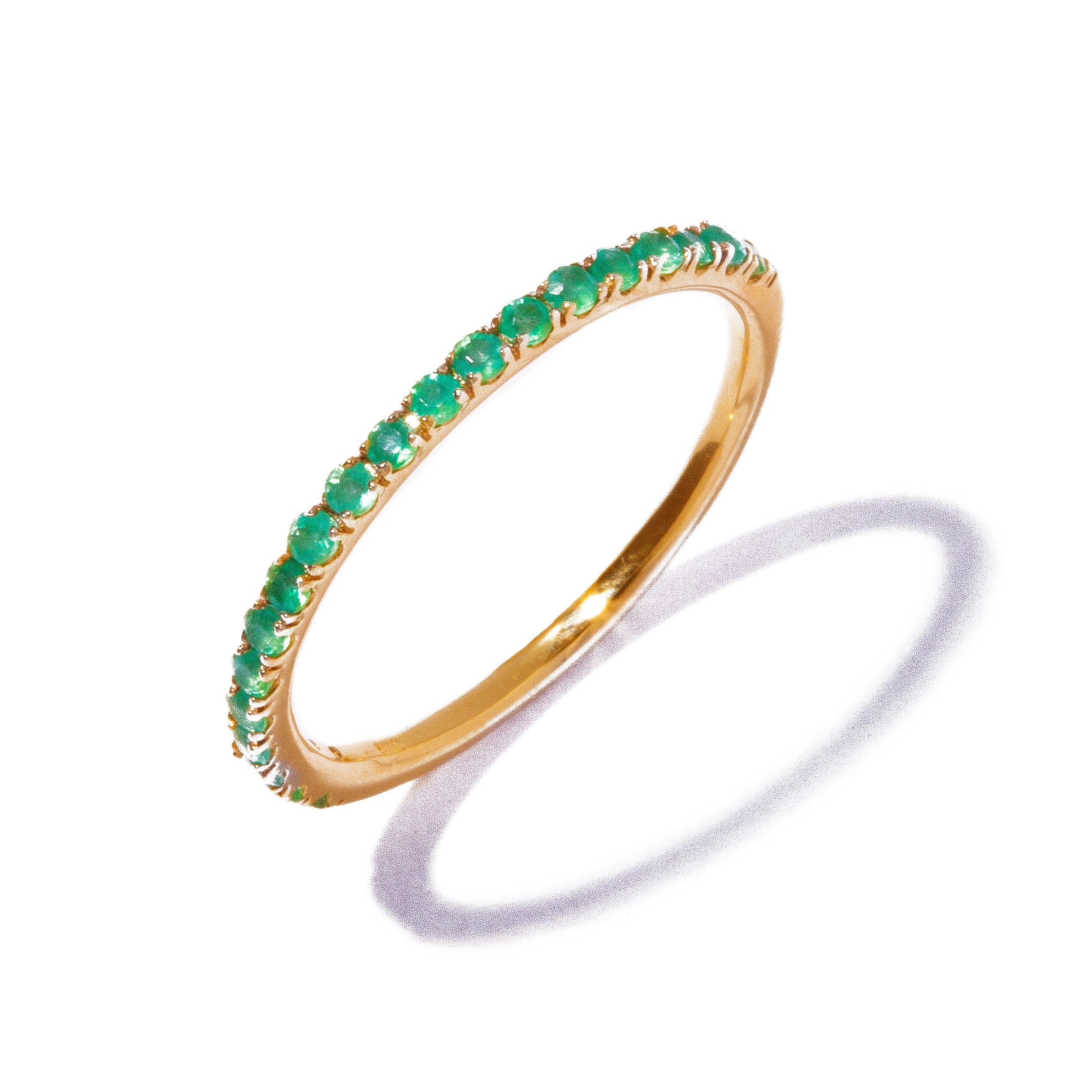 半周のみに敷き詰めた華やかな輝きとシャープな線によって、エメラルドの凛としたオーラを放つリング。