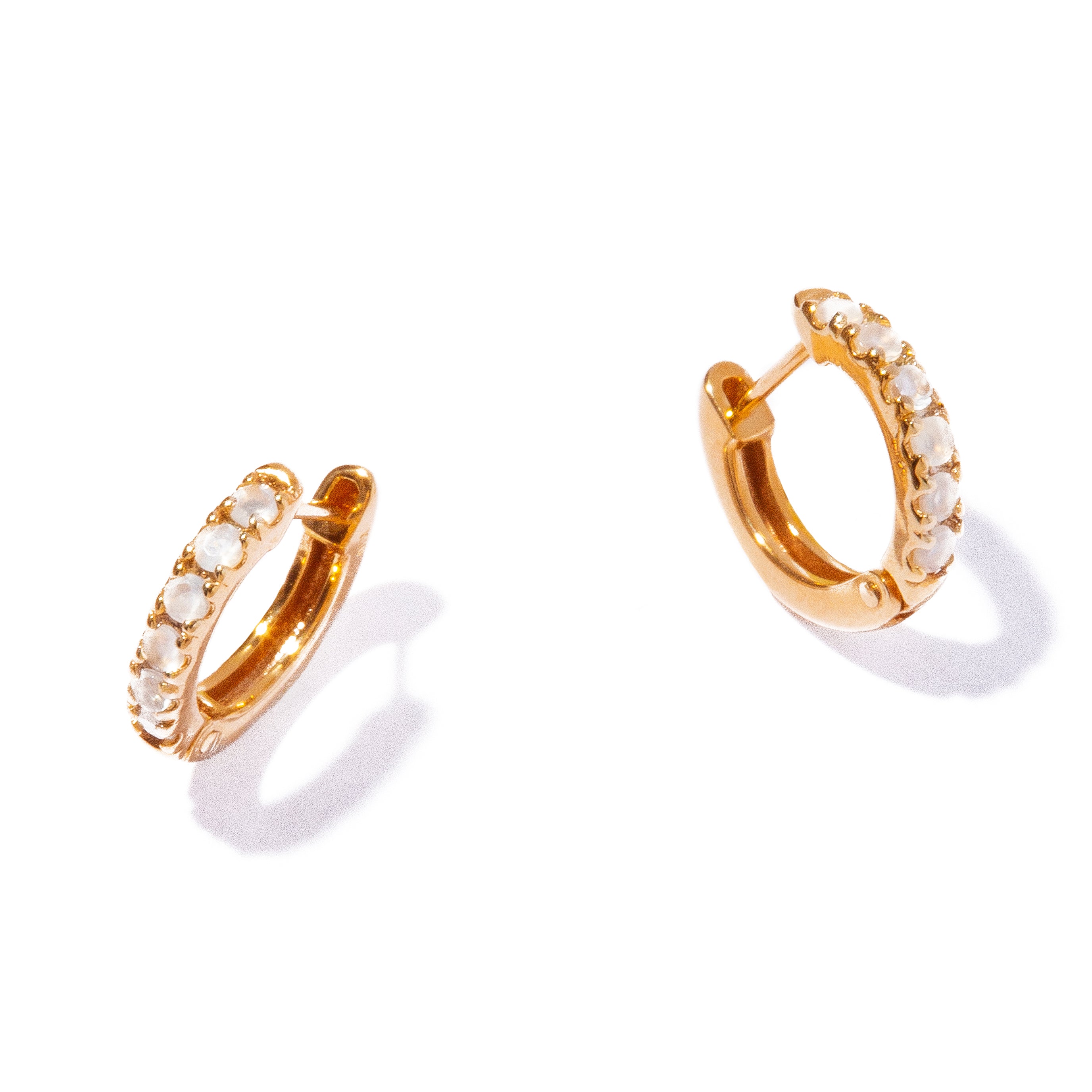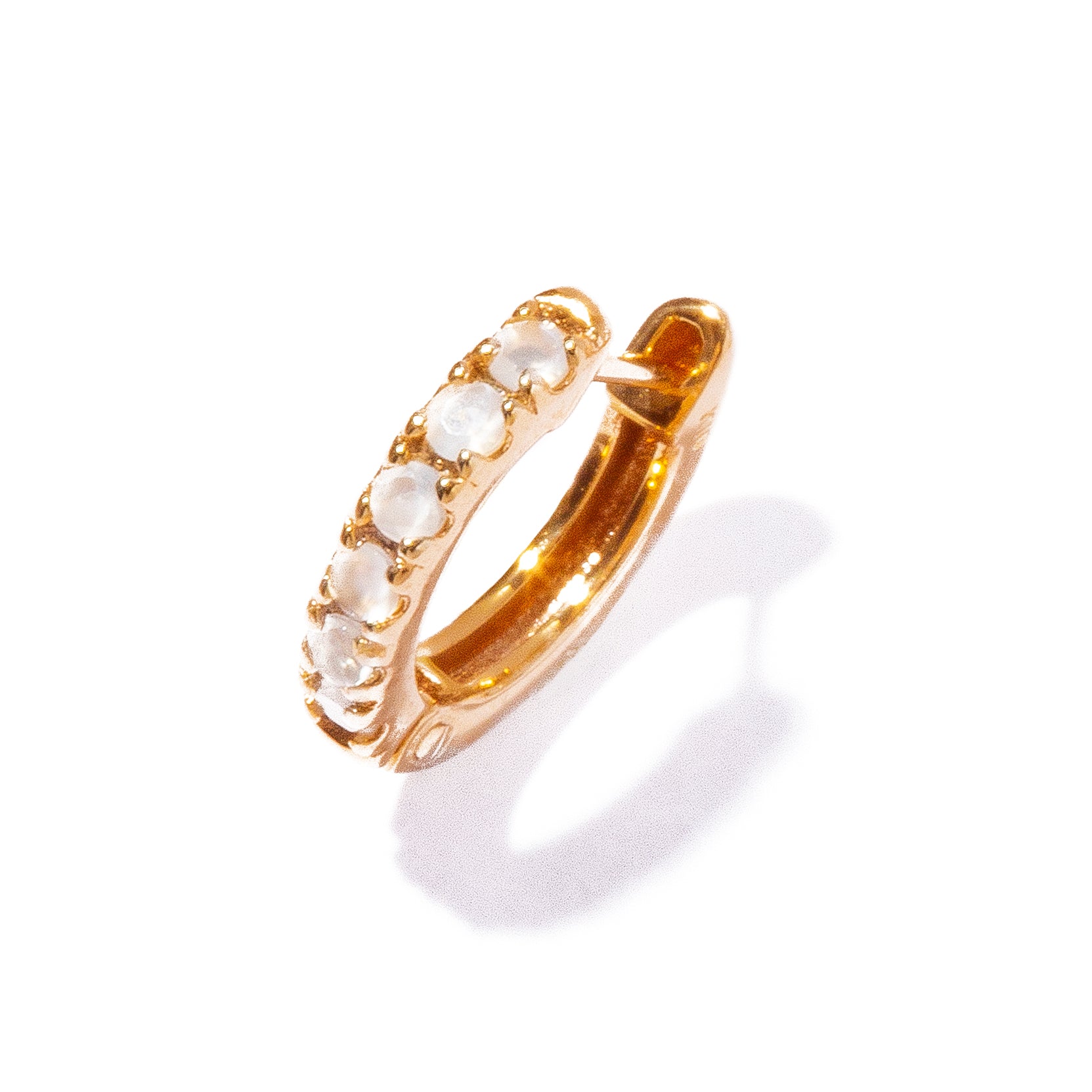 正面に敷き詰めたムーンストーンの柔らかな輝きとシャープな線によって、凛としたオーラを放つピアス。