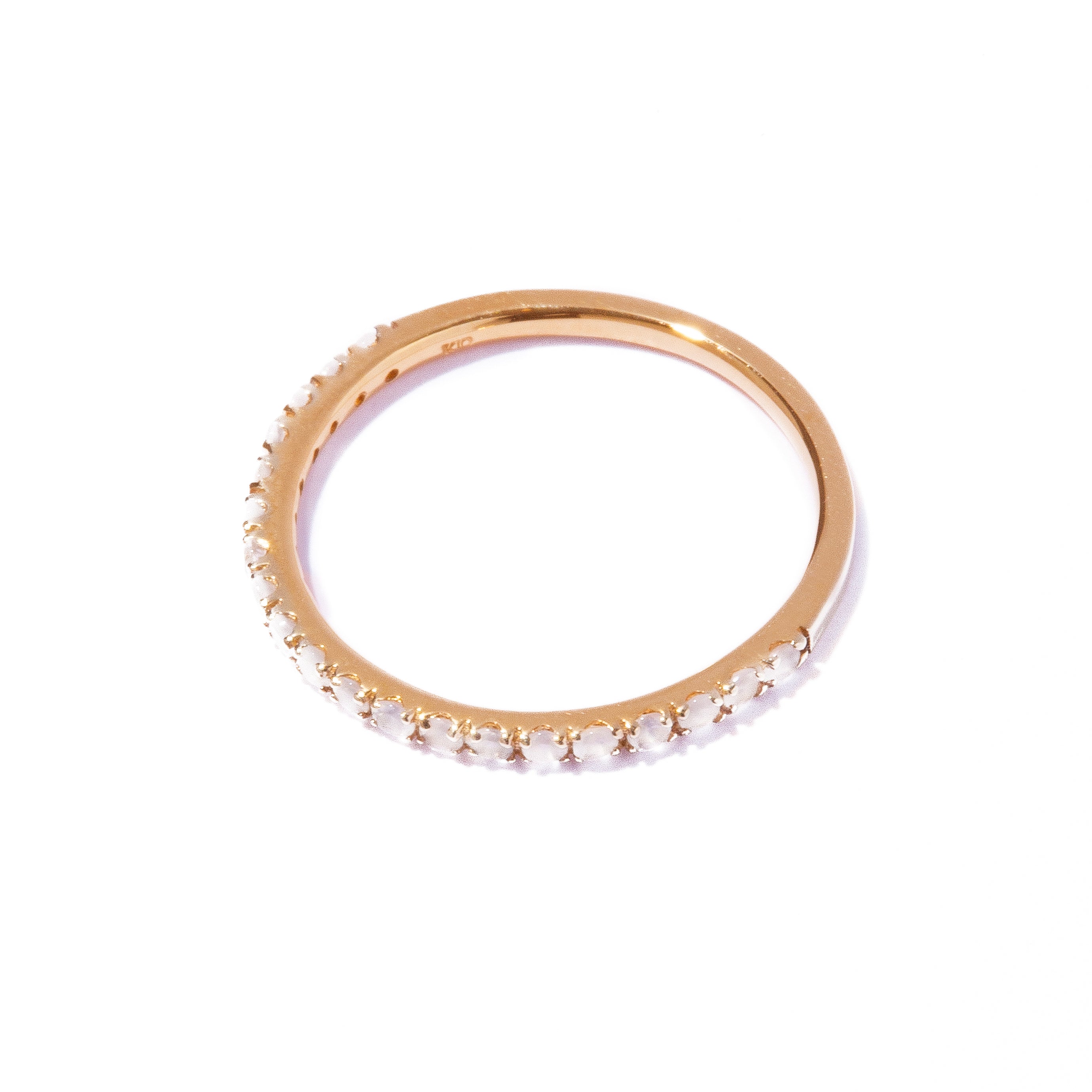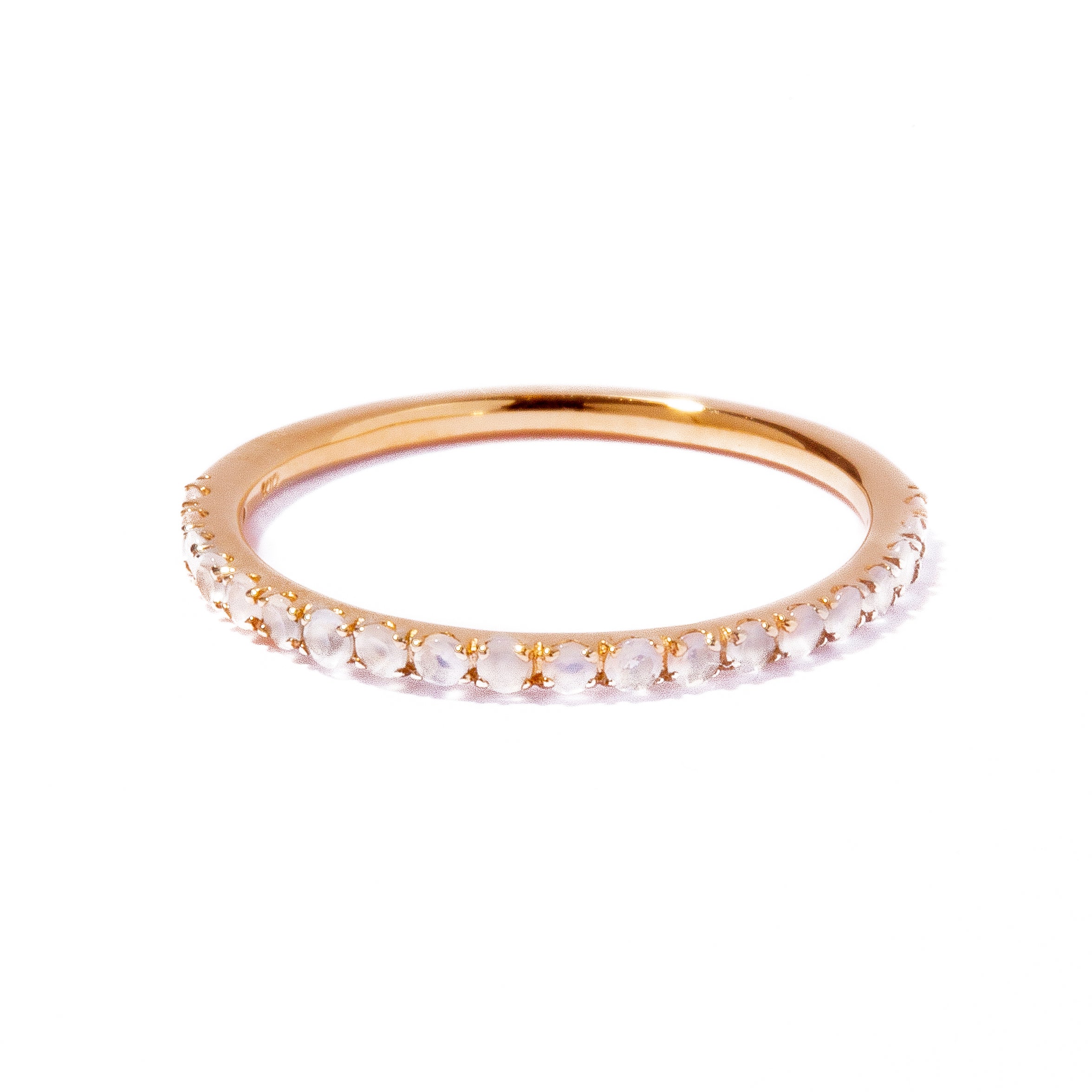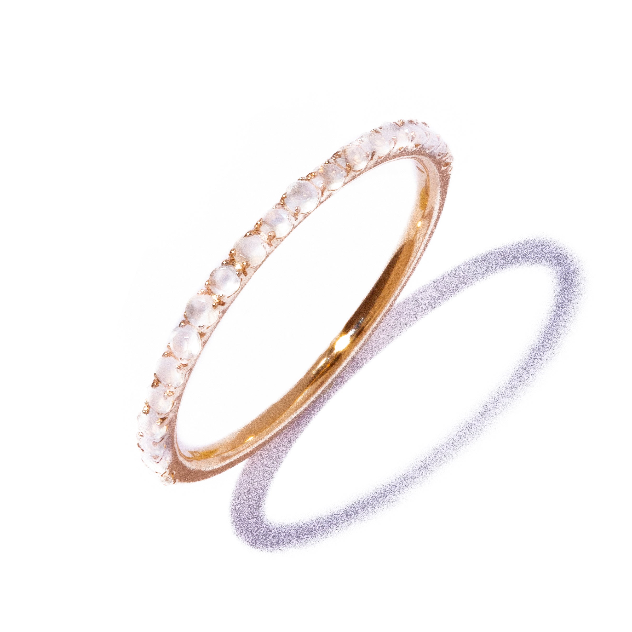 半周のみに敷き詰めたムーンストーンの柔らかな輝きとシャープな線によって、凛としたオーラを放つリング。