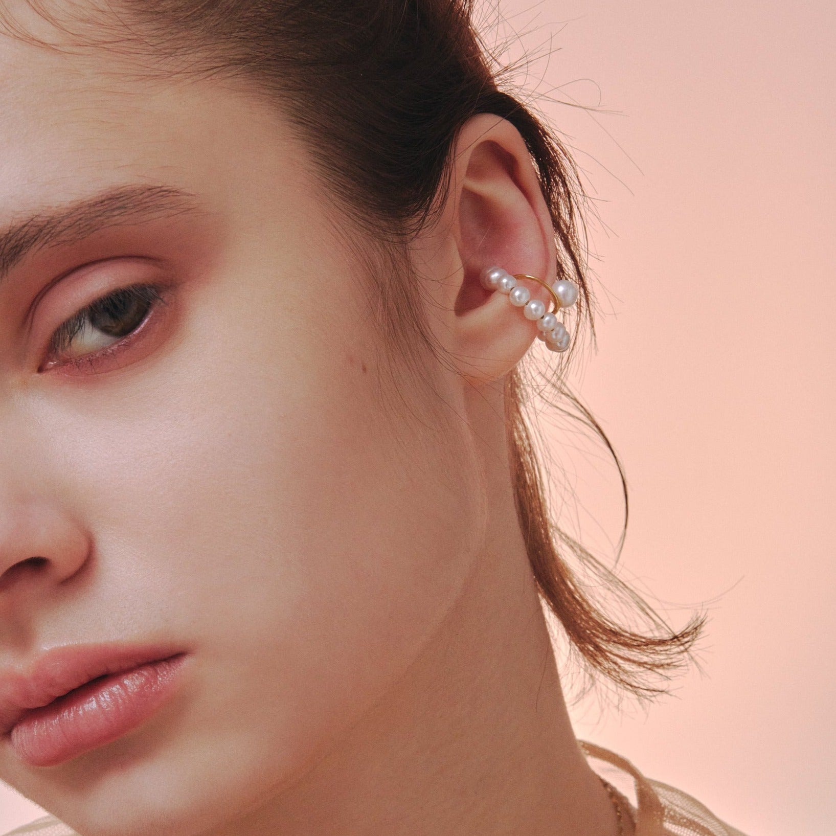 見る角度によって浮かび上がるように見えるパールは、耳元のレイヤードに洗練感のある表情を生み出します。