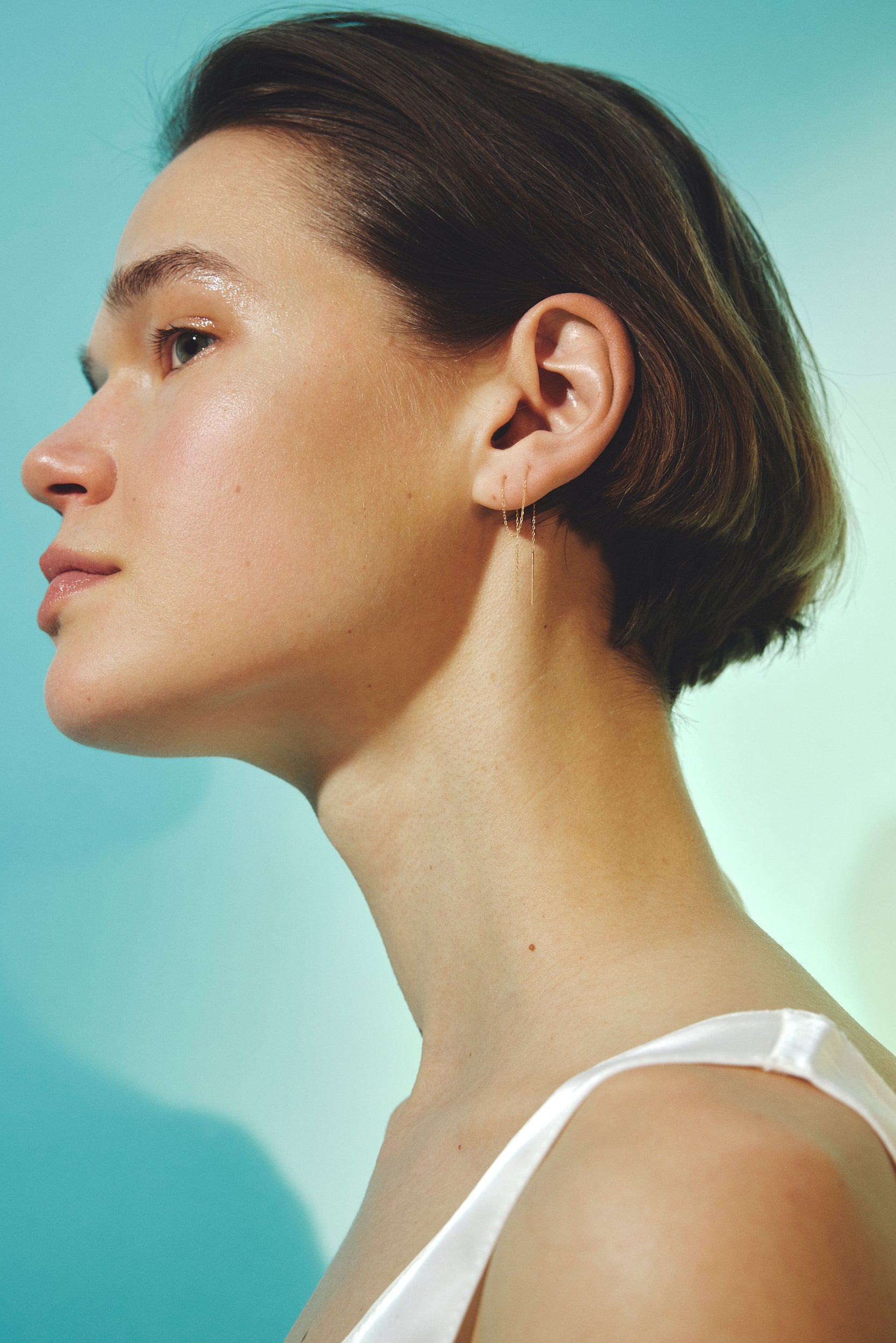 ひとつのピアスホールに通せば、ダイナミックで魅惑的なシルエットを描きます。