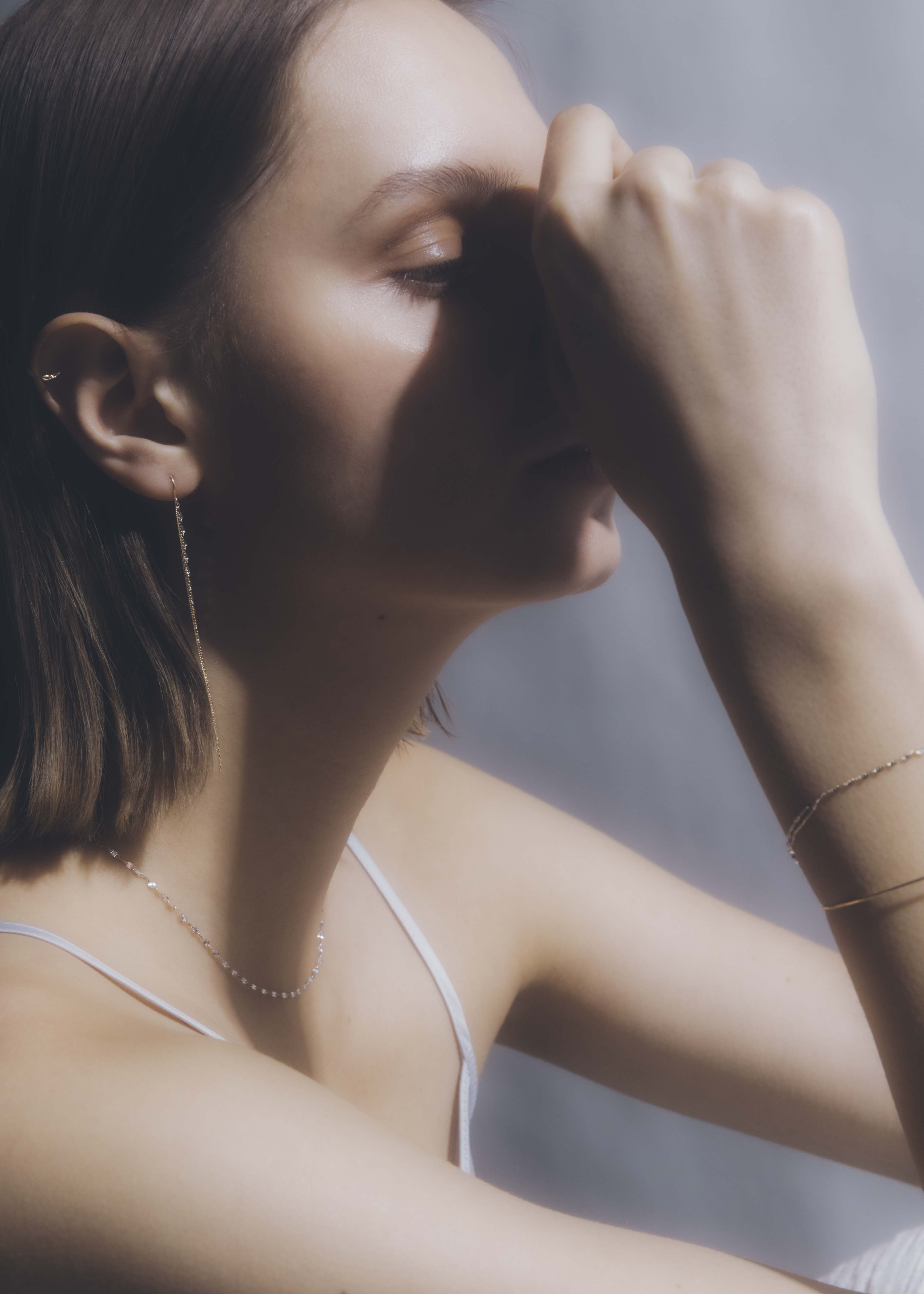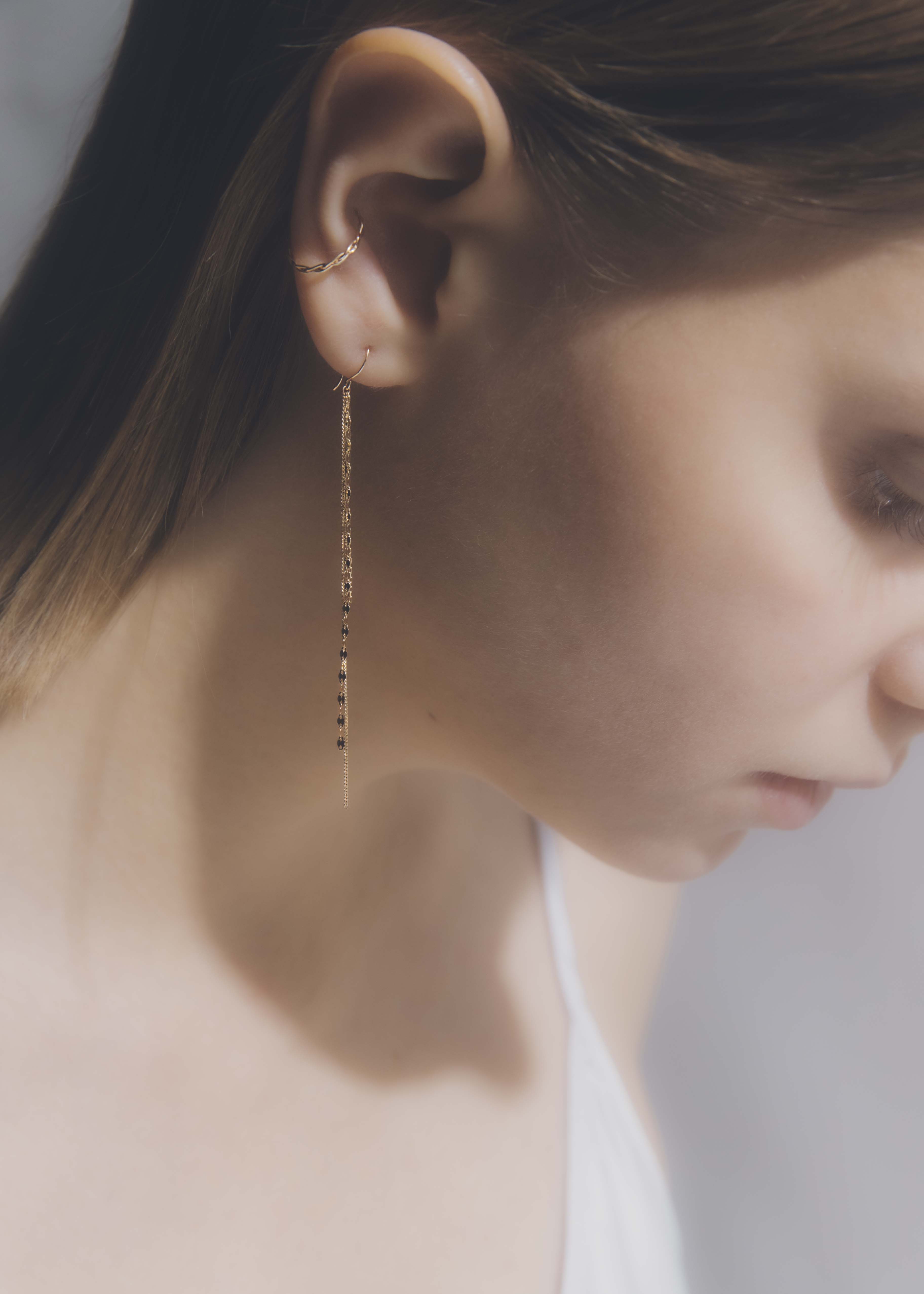 繊細なチェーンが顔まわりで揺れ動き、顔まわりに女性らしい印象を与えます。