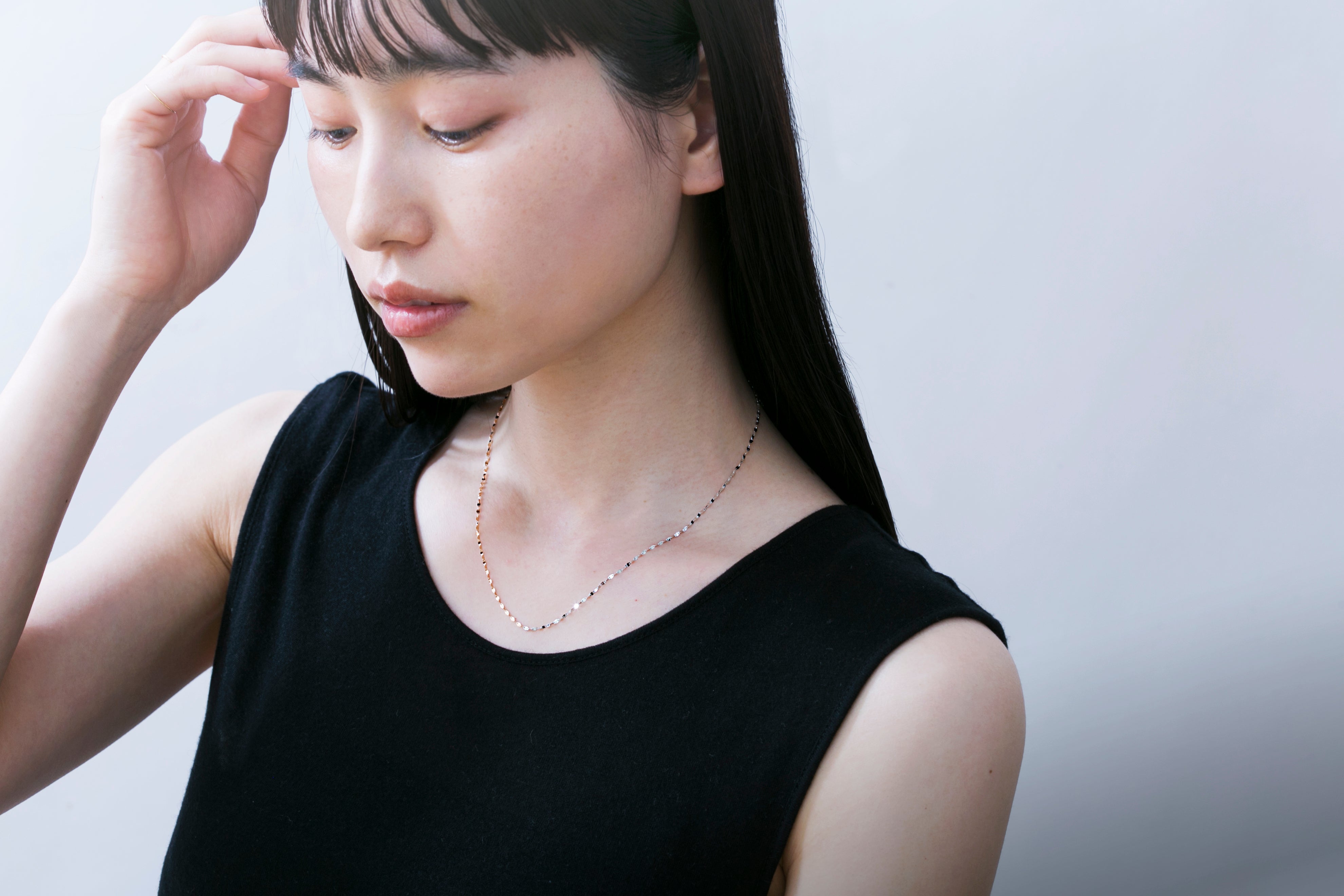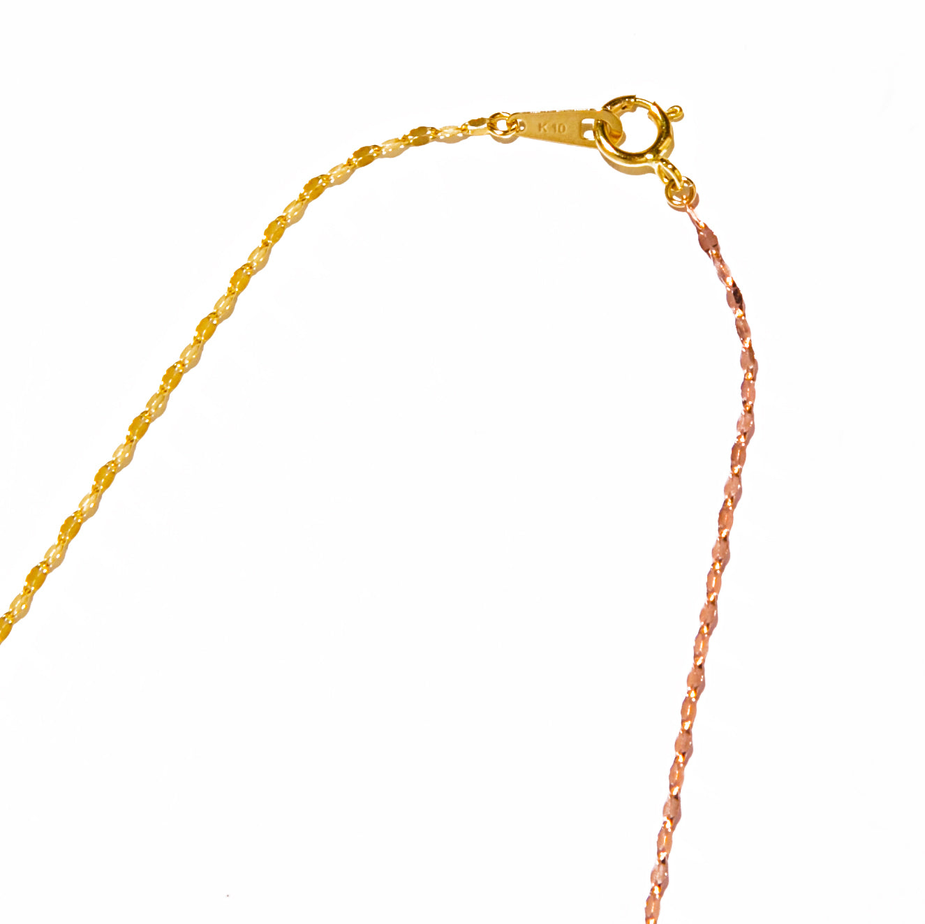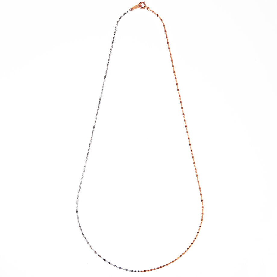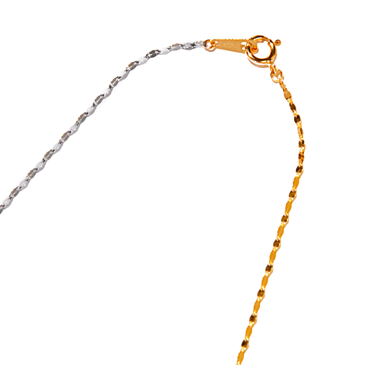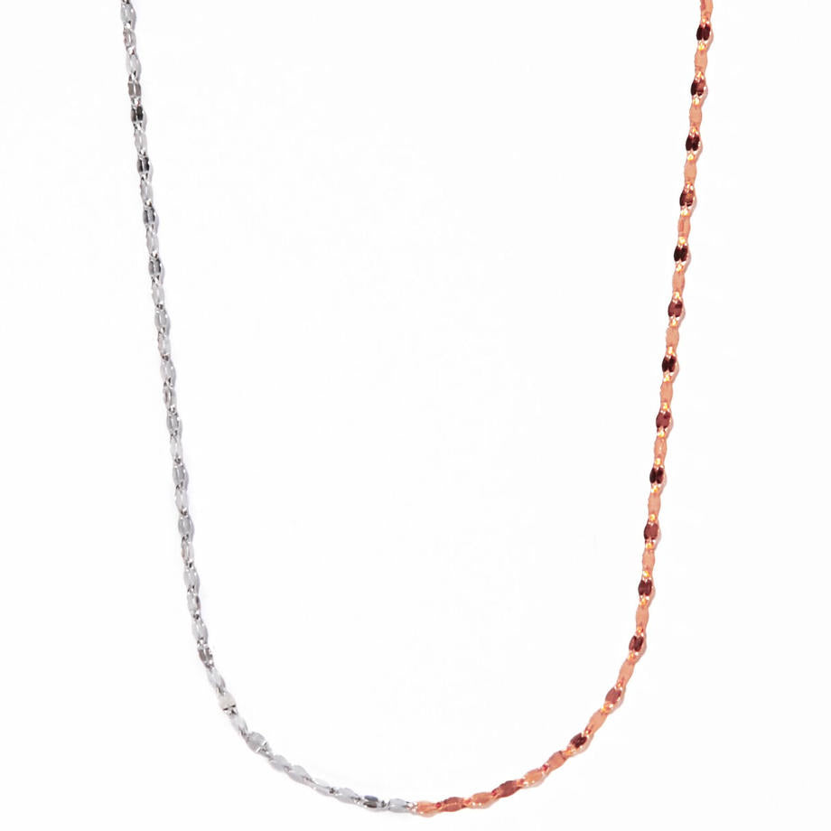 女性らしいピンクゴールド、凛としたホワイトゴールドが組み合わさり華やかさの中にエッジィな雰囲気のあるネックレスです。